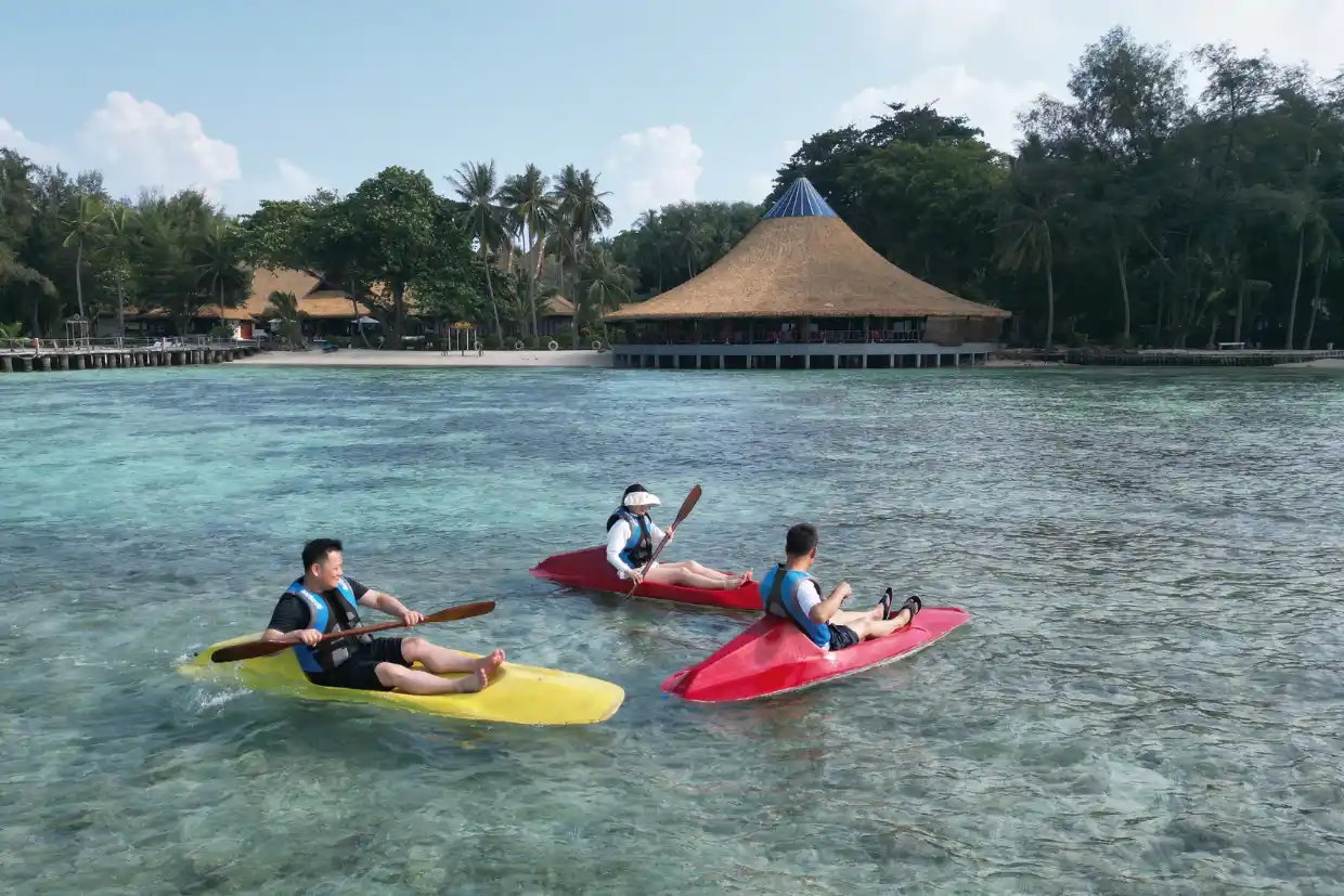 Paket juga sudah memberi aktivitas seperti snorkeling 1 jam atau canoe 30 menit, ditambah akses ke fasilitas resort seperti kolam renang, playground, volley, tenis meja, tenis, dan karaoke. Ini membuat liburan 2D1N tetap terasa terisi tanpa itinerary yang padat.